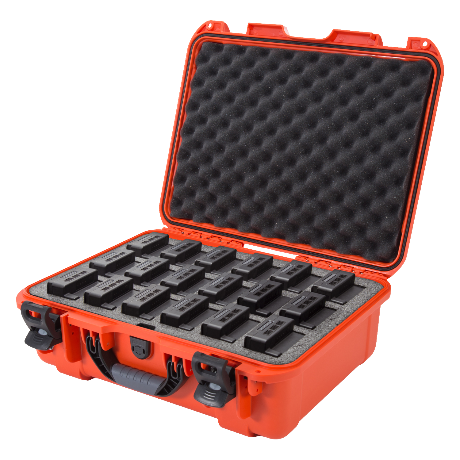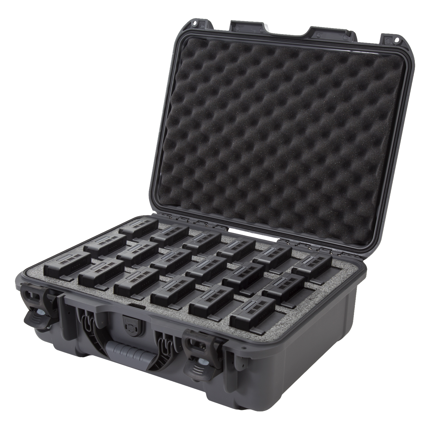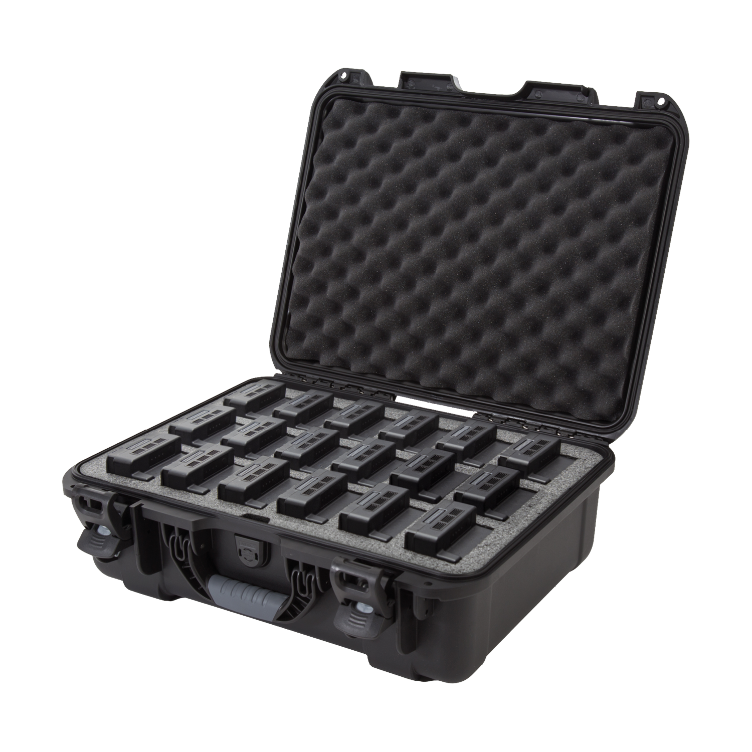 The high-density closed-cell foam insert is pre-cut to securely hold up to 18 DJI™ TB55 or TB50 batteries, along with charging accessories such as cables and adapters. This layout keeps each battery isolated, organised, and protected, reducing the risk of short-circuits, damage, or disarray during transport or storage.