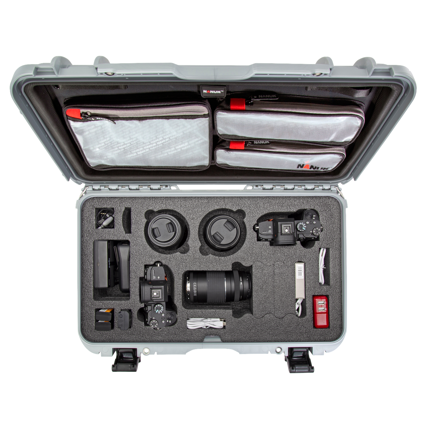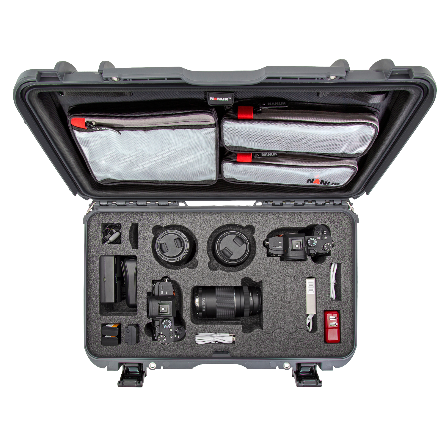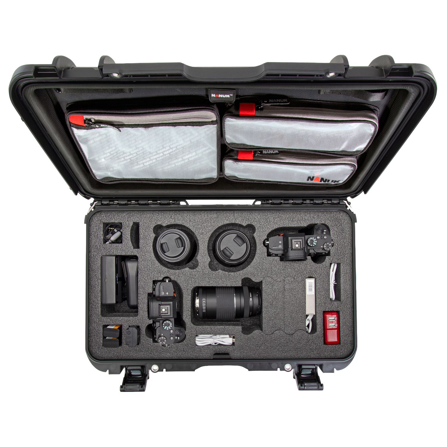 The NANUK 935 DSLR Camera Case is engineered to provide compartmentalised protection and organisation for all your photo and video equipment. Its pre-cut foam securely holds two DSLR camera bodies, a 16-35mm lens, a 24-70mm lens, and features an adjustable compartment for larger lenses such as a 70-200mm. Additional spaces accommodate multiple batteries, flash drives, USB cables, a charging hub, and other essential accessories.