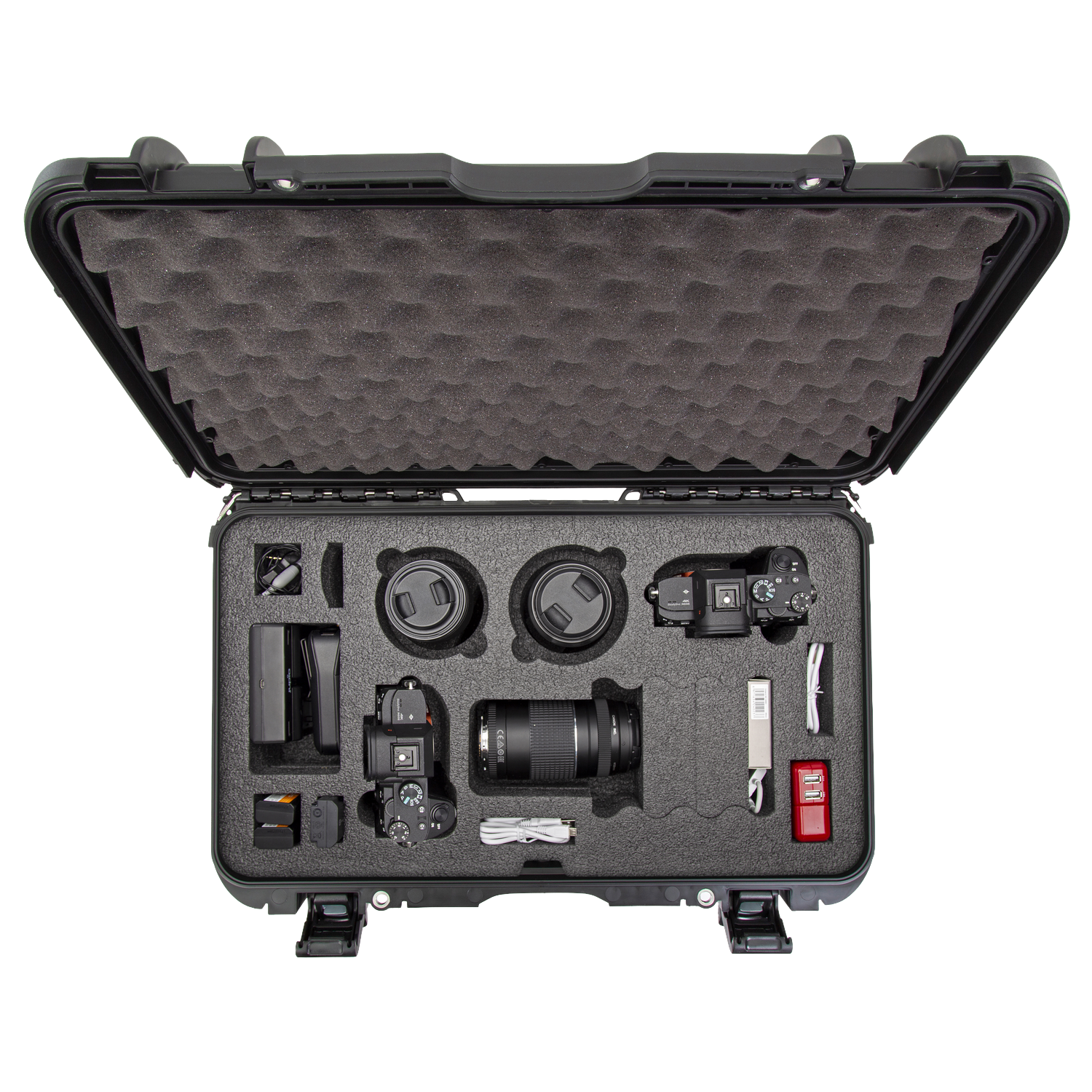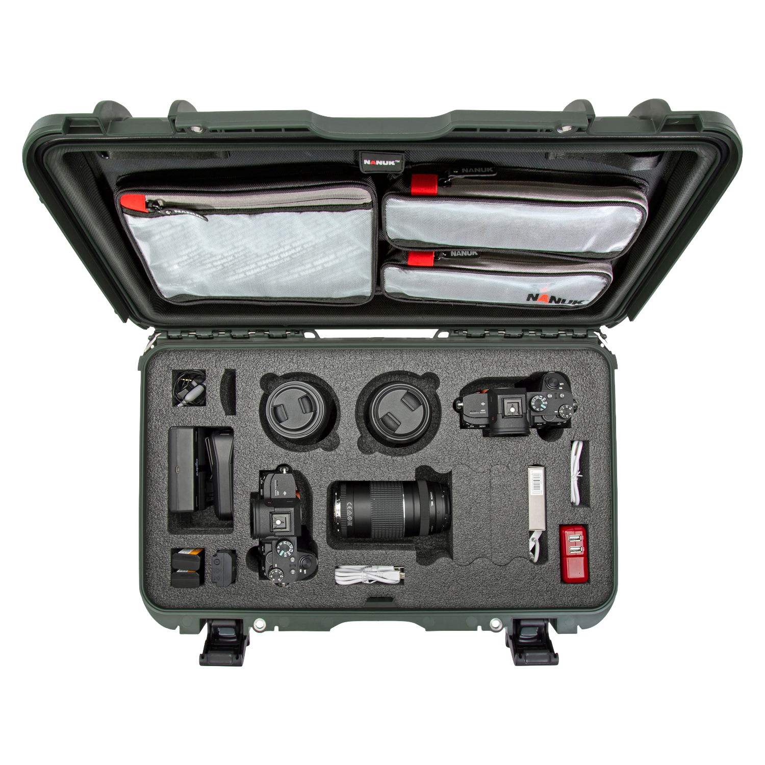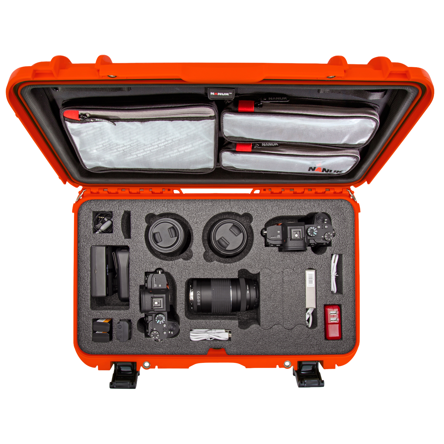 The NANUK 935 DSLR Camera Case is engineered to provide compartmentalised protection and organisation for all your photo and video equipment. Its pre-cut foam securely holds two DSLR camera bodies, a 16-35mm lens, a 24-70mm lens, and features an adjustable compartment for larger lenses such as a 70-200mm. Additional spaces accommodate multiple batteries, flash drives, USB cables, a charging hub, and other essential accessories.